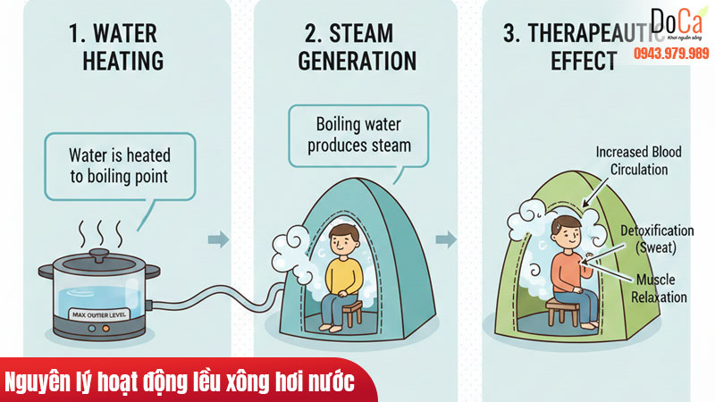 - Bước 3: Hơi nước được đẩy qua ống dẫn vào bộ lều xông hơi.